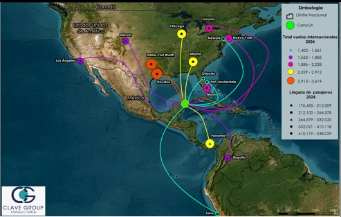 En el mapa se representan los 15 destinos con mayor cantidad de vuelos, brindando una visión clara de los mercados clave para el aeropuerto de Cancún.