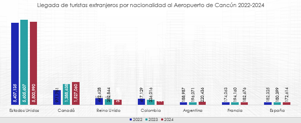El Aeropuerto Internacional de Cancún sigue siendo uno de los principales puntos de entrada para el turismo extranjero en México. En 2024, más del 50% de los visitantes internacionales provinieron de Estados Unidos, consolidando a este país como el principal mercado emisor.